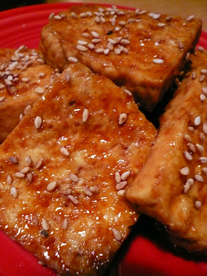 The tofu is sauteed in oil until brown and then garlic, a tablespoon of corn syrup, a tablespoon of soy sauce are added and cooked for about another 30 seconds (until the liquid evaporates). The dish is finished with a sprinkling of sesame seeds.