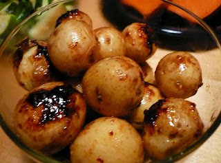 Tonight we had rice with lots of banchan: seaweed, kimchi, yams, seasoned potatoes (gamja jorim)...