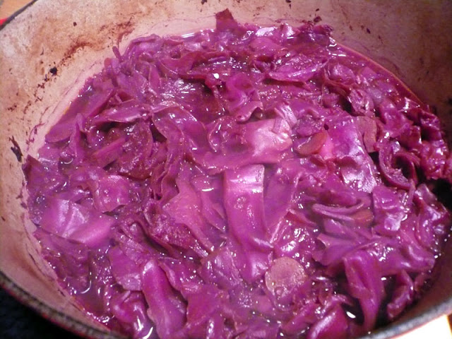 Julia Child's recipe mentioned that the acidity in the apples & wine help keep the cooked cabbage red. Yeah, and I think the red in the red wine didn't hurt either!