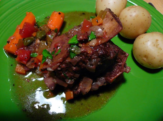 Tonight we had some grass-fed beef ribs we bought from New York Beef at our farmers' market. It was braised for 2 1/2 hours in a Provençale-style along with potatoes. For dessert we had leftover strawberry-rhubarb cobbler.